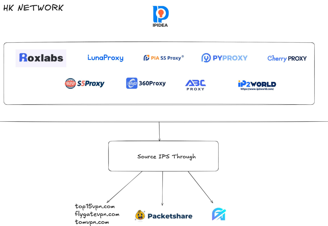A graphic depicting the relationship between proxy providers that Synthient found are white labeling IPidea proxies. Image: Synthient.com.