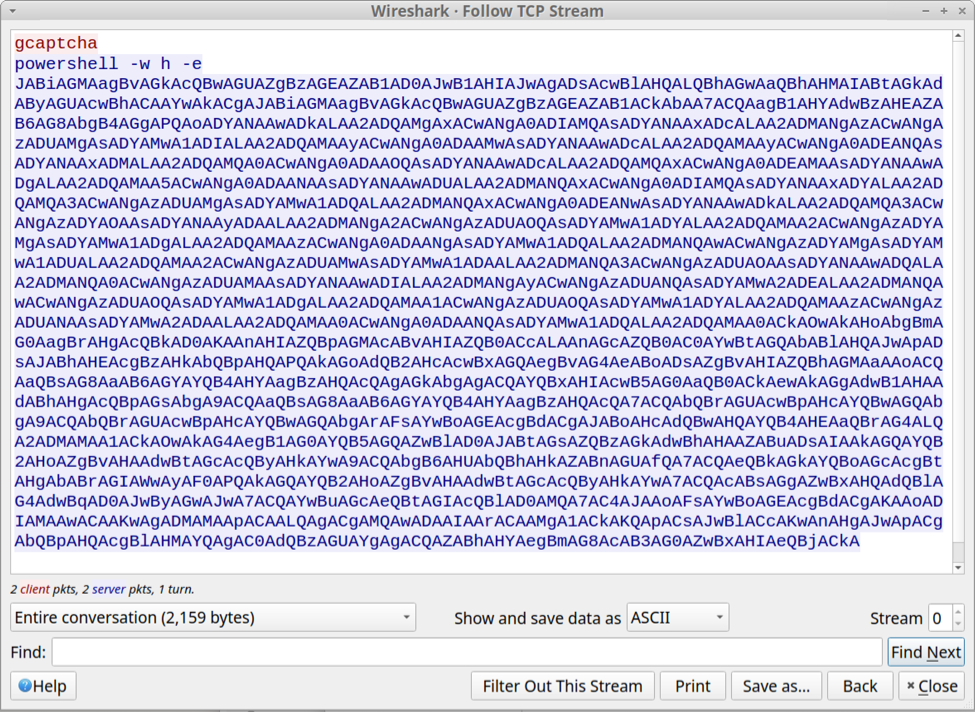 Following the TCP stream of this traffic revealed text returned from the server. The result was a powershell command with Base64 encoded text.