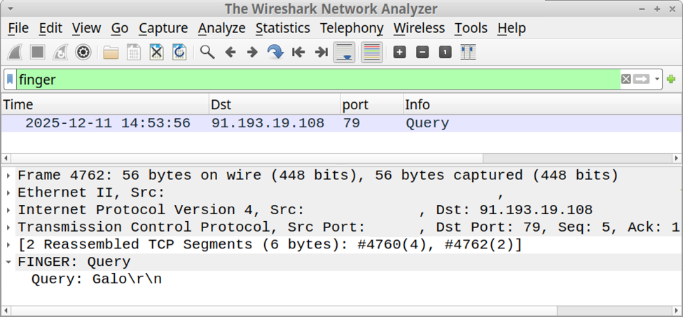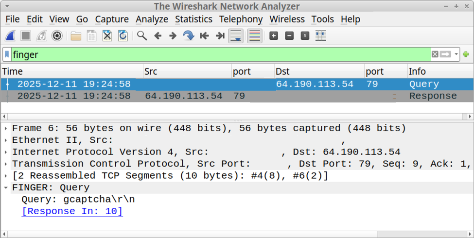 I recorded network traffic generated by running this ClickFix script, and I used the finger filter in Wireshark to find finger traffic over TCP port 79.