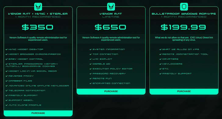 Based on the open-source Quasar RAT, Venom RAT is a commercial tool that’s offered for $650 for a lifetime license. A one-month subscription bundling the malware with HVNC and Stealer components, costs $350.