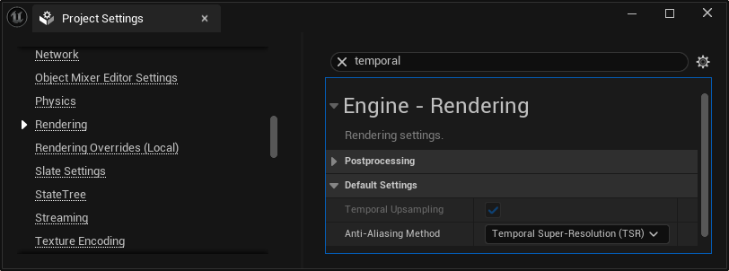 Temporal Upsampling must be enabled, and Anti-Aliasing Method should be set to Temporal Super-Resolution (TSR) in the Project Settings > Rendering window, accessed via Edit > Project Settings in the Unreal Engine toolbar or via Console Variables by enabling r.TemporalAA.Upsampling and setting r.AntiAliasingMethod to 4.