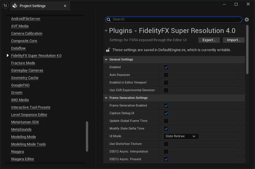 FSR 4 can be enabled or disabled via the Enabled option in the Project Settings > FidelityFX Super Resolution 4.0 settings window, or with the console variable r.FidelityFX.FSR4.Enabled in the configuration files. The variable can be modified at runtime. However, this is not guaranteed to be safe when other third-party upscalers are also enabled.