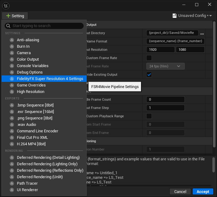 The FSR4MovieRenderPipeline plugin, once enabled, allows using FSR 4 to accelerate rendering of Sequencer cinematics using Unreal’s Movie Render Queue.