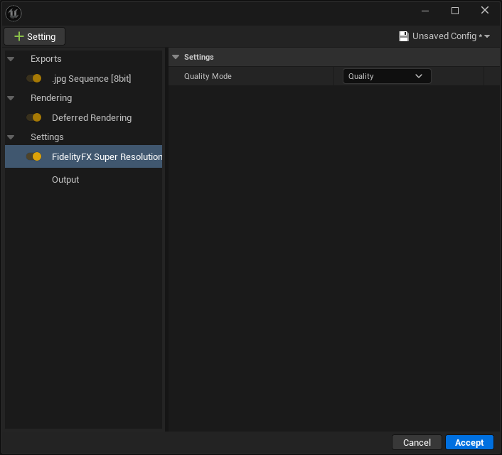 This can also be set via the Quality Mode option in the Project Settings > FidelityFX Super Resolution 4.0 settings window.