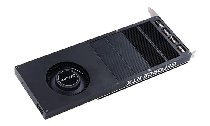 With such a thickness, it’s difficult to mount anything other than a radial fan, which is why they’ve included a blower, admittedly thin, but a blower nonetheless. Mounted in a multi-GPU configuration, this type of fan expels hot air from the case. This type of cooling is particularly well-suited to multi-GPU configurations.