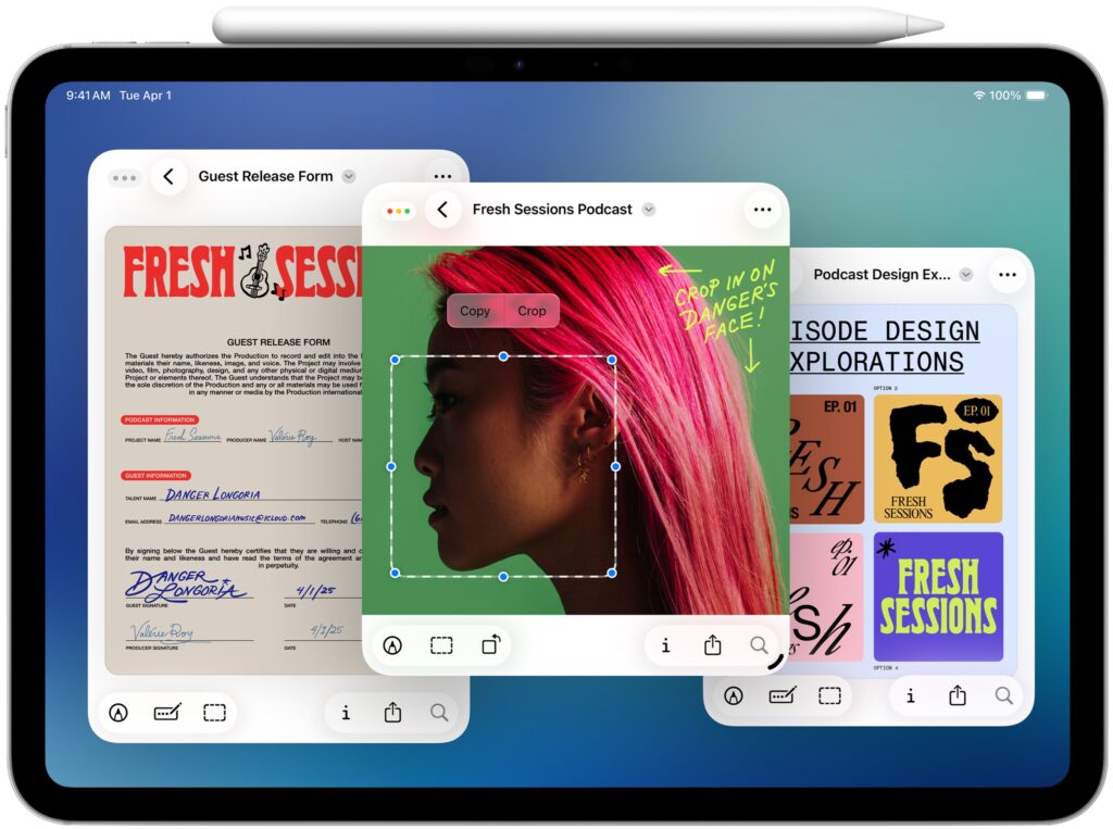 - Window management: Every app can now be transformed into a standalone window that you can move and resize freely. Windows remember their size and position, and you can tile them flexibly, with options to split the screen into two, three, or four sections. The familiar traffic light window controls from the Mac reappear along with the macOS Move & Resize and Fill & Arrange options. Swiping up invokes Exposé, allowing you to view all windows and switch to your desired one easily.