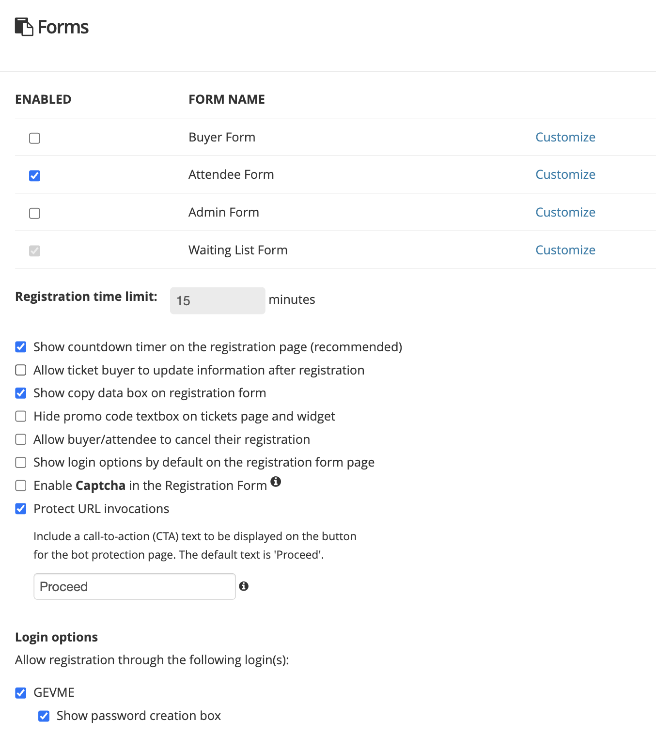Before you even think about adding custom fields, Gevme gives you powerful tools to optimize the registration experience. The Forms section shows you different form types – Attendee Form, Buyer Form, Admin Form, and Waiting List Form. Most events only need the Attendee Form enabled, but the key is in the configuration details.