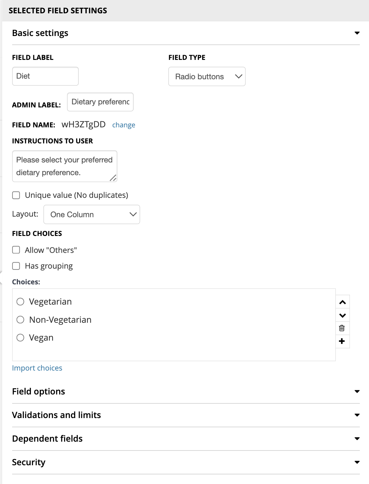 The field type matters enormously. Radio buttons work better than dropdown menus for choices people need to consider (like dietary preferences) because all options are visible at once. Use the instructions field to provide context: “Please select your dietary preference” is better than leaving people to guess what you’re asking for.