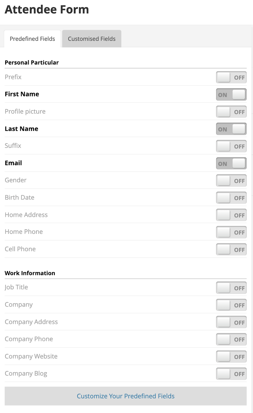 Start with the essentials turned ON (First Name, Last Name, Email) and only activate additional fields that serve a specific business purpose. Need networking functionality? Turn on Job Title and Company. Planning catering? Add dietary preferences through the Customized Fields option.