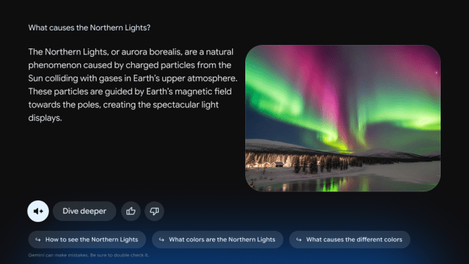 At CES, Google showed how this would work. When users ask a question about something they want to learn about, the TV screen can offer a deep dive into the topic. A narrated interactive overview simplifies concepts, and users can ask follow-up questions to learn more.